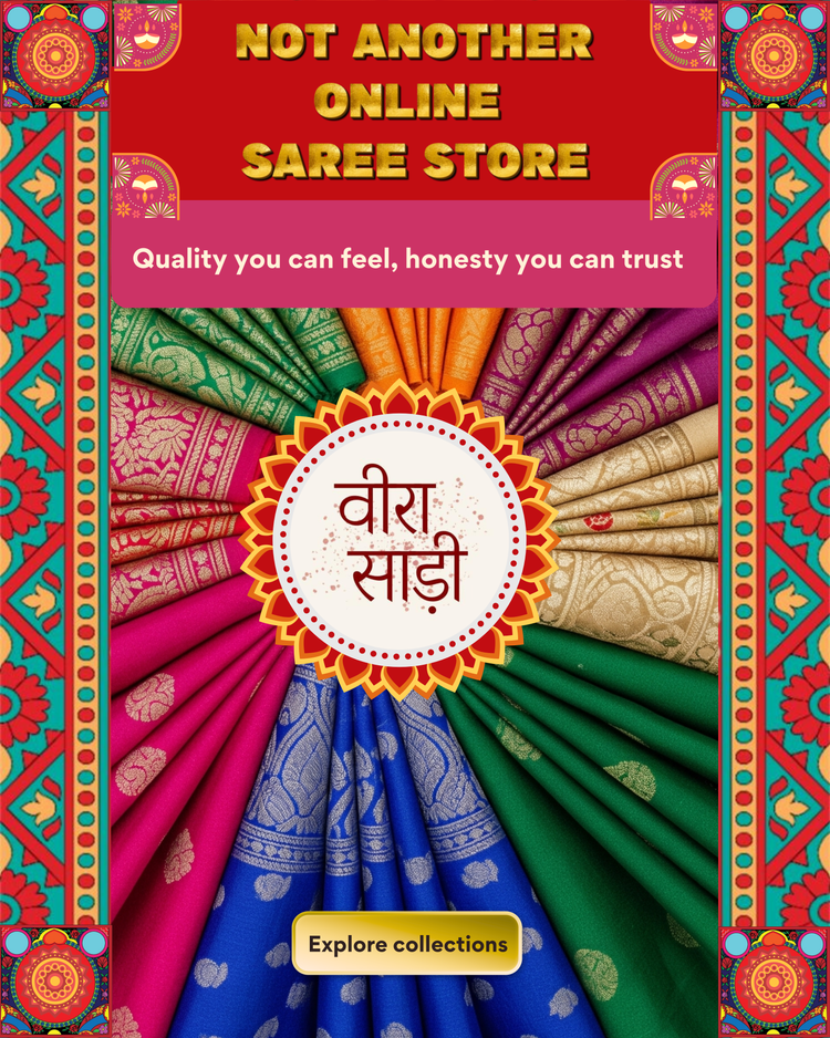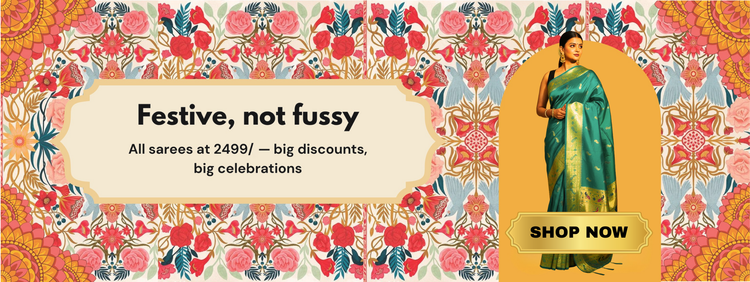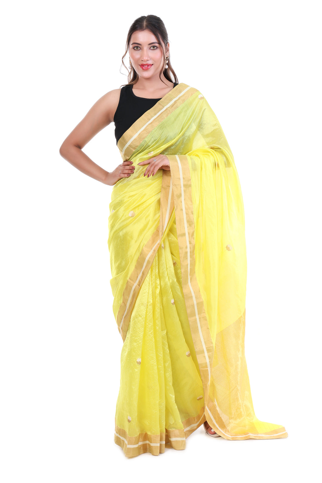 This saree is woven with classic Chanderi motifs all over the body and finished with a striking gold-zari temple border that echoes South Indian temple architecture.