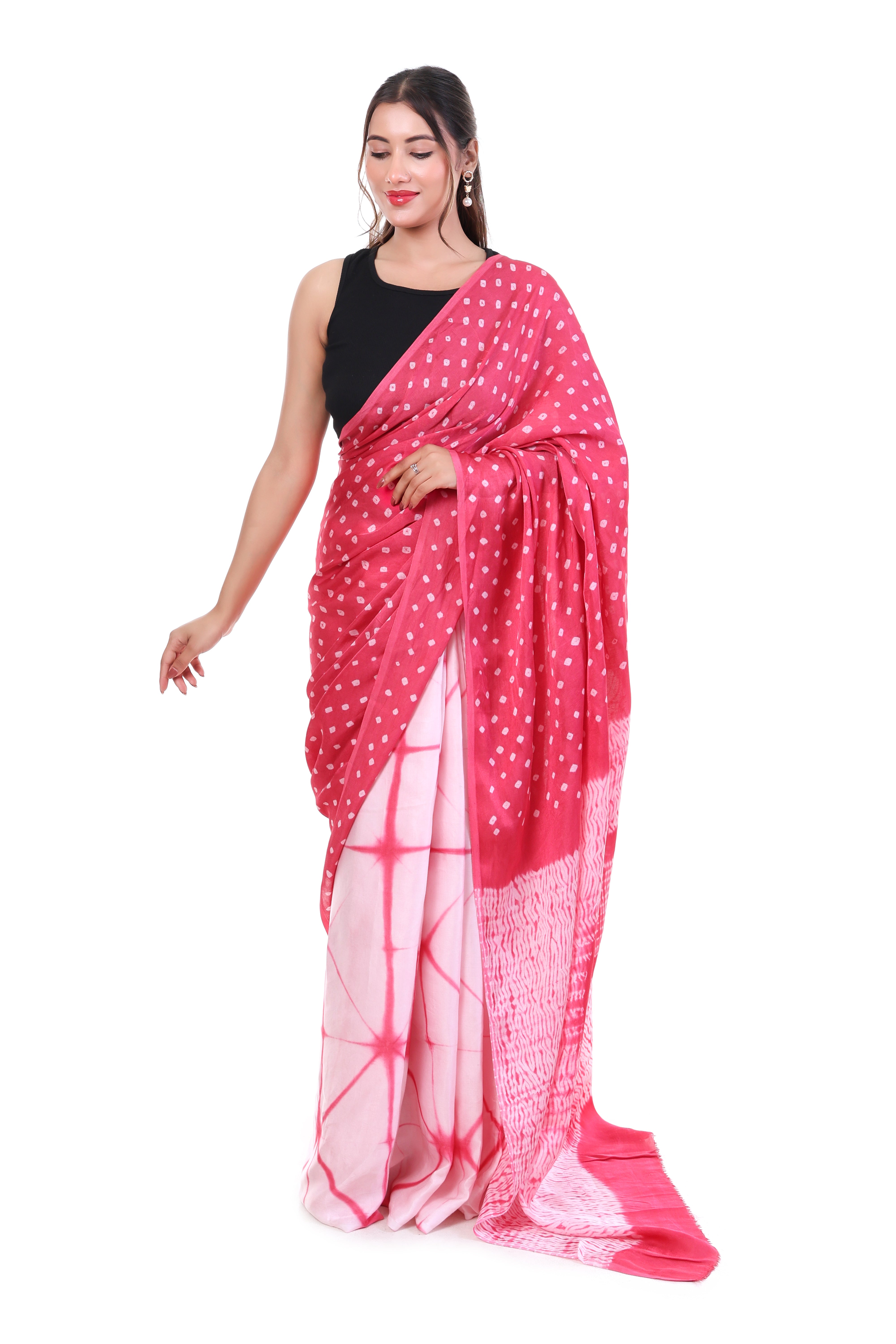 This exquisite saree is a celebration of two traditional crafts – Shibori dyeing and Bandhani tie-dye – beautifully fused on luxurious Gazi Silk. The highlight of the saree is its hypnotic circular Shibori pattern in rich Carnation Pink and white, creating a mesmerizing visual effect. The pallu and pleats feature delicate Bandhani knots that add texture and depth to the piece.