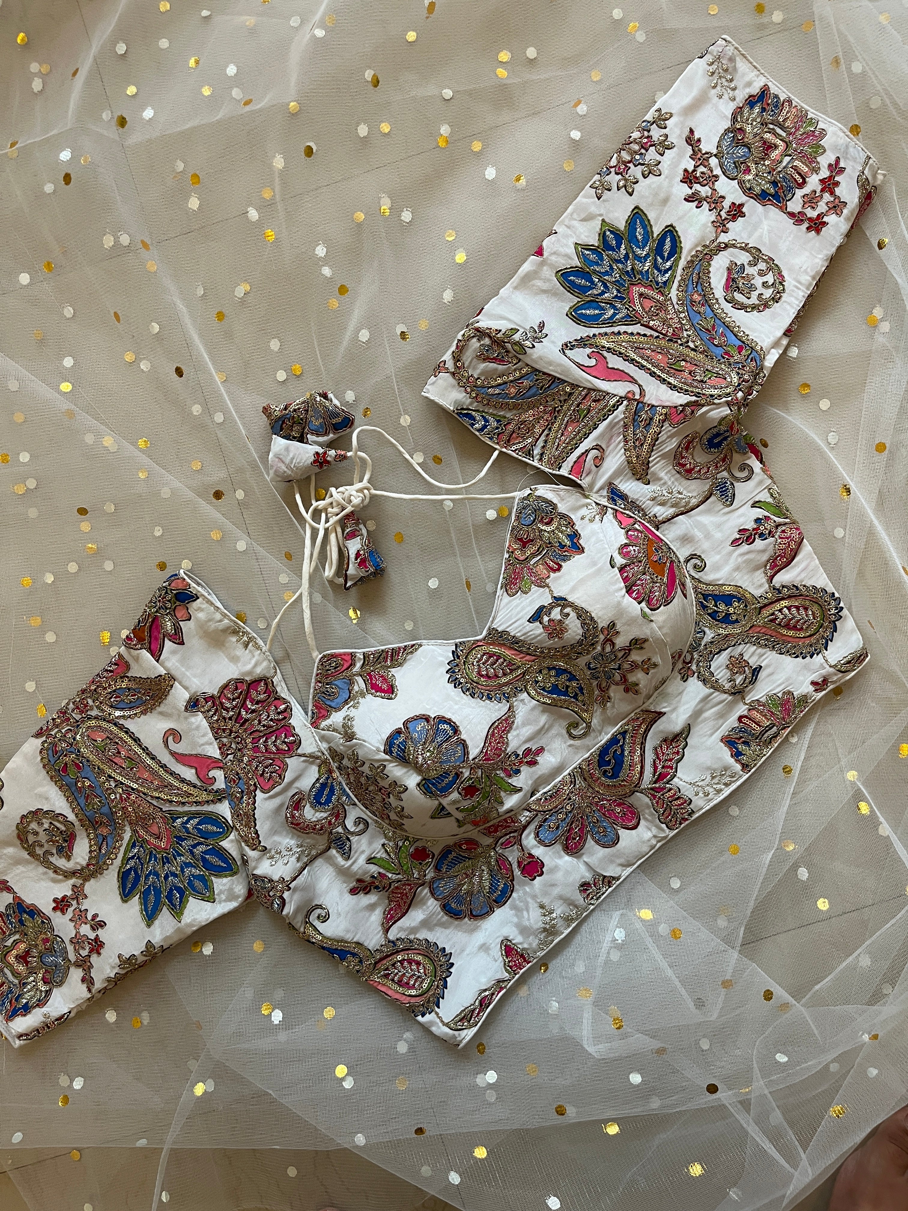 Elevate your ethnic wardrobe with this stunning embroidered blouse. Crafted from soft fabric, it features intricate paisley motifs and vibrant embellishments, perfect for festive occasions. Pair it effortlessly with your favorite saree for a chic look.