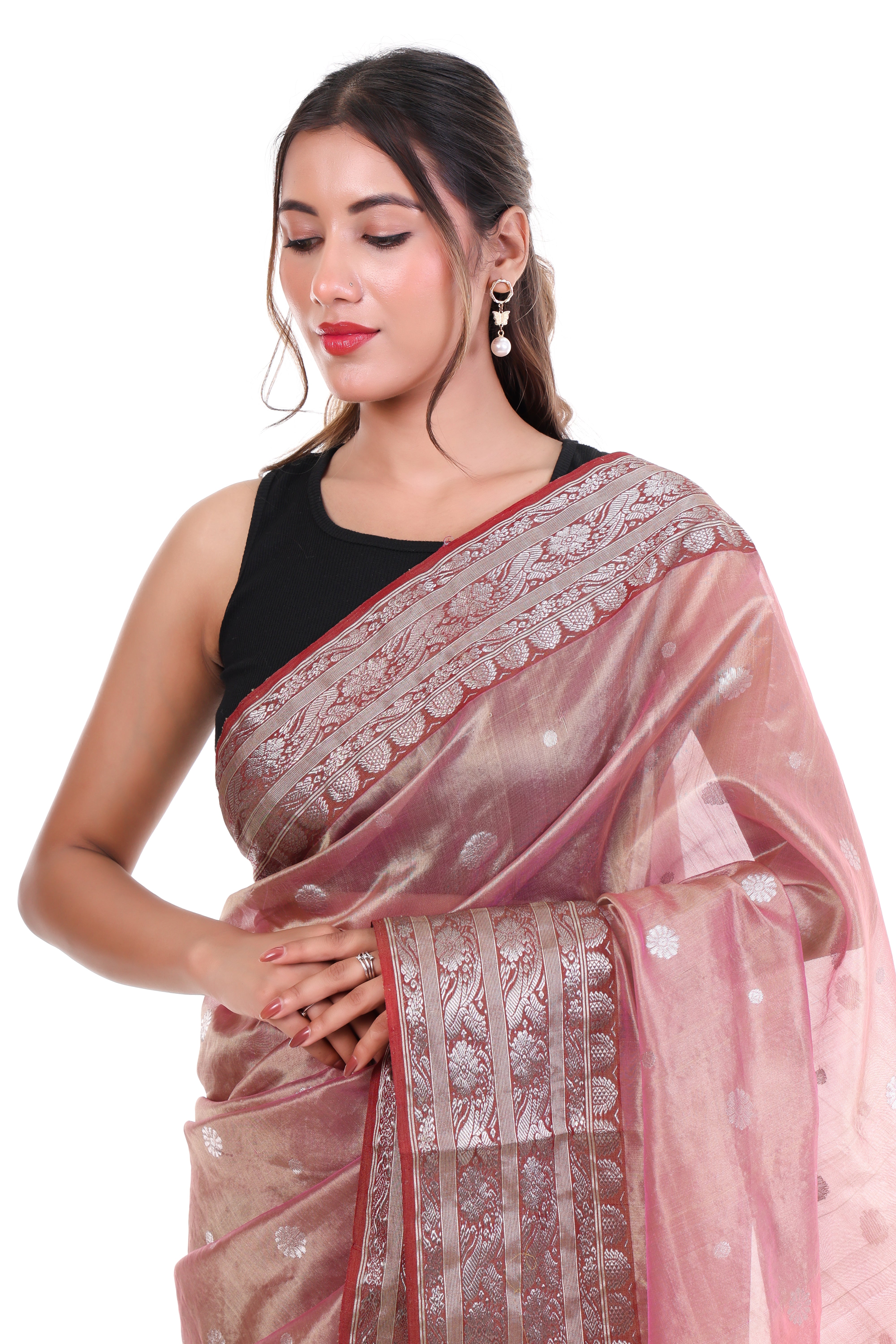 This pure silk Chanderi handloom saree dazzles in a muted rose-pink tone shot through with silver-grey, creating an ever-changing iridescence as light plays across its surface. Woven with intricate silver zari motifs all over the body and framed by a broad floral zari border, the luxe pallu cascades in shifting hues that glow from soft blush to metallic sheen—perfect for evening gatherings or grand celebrations.