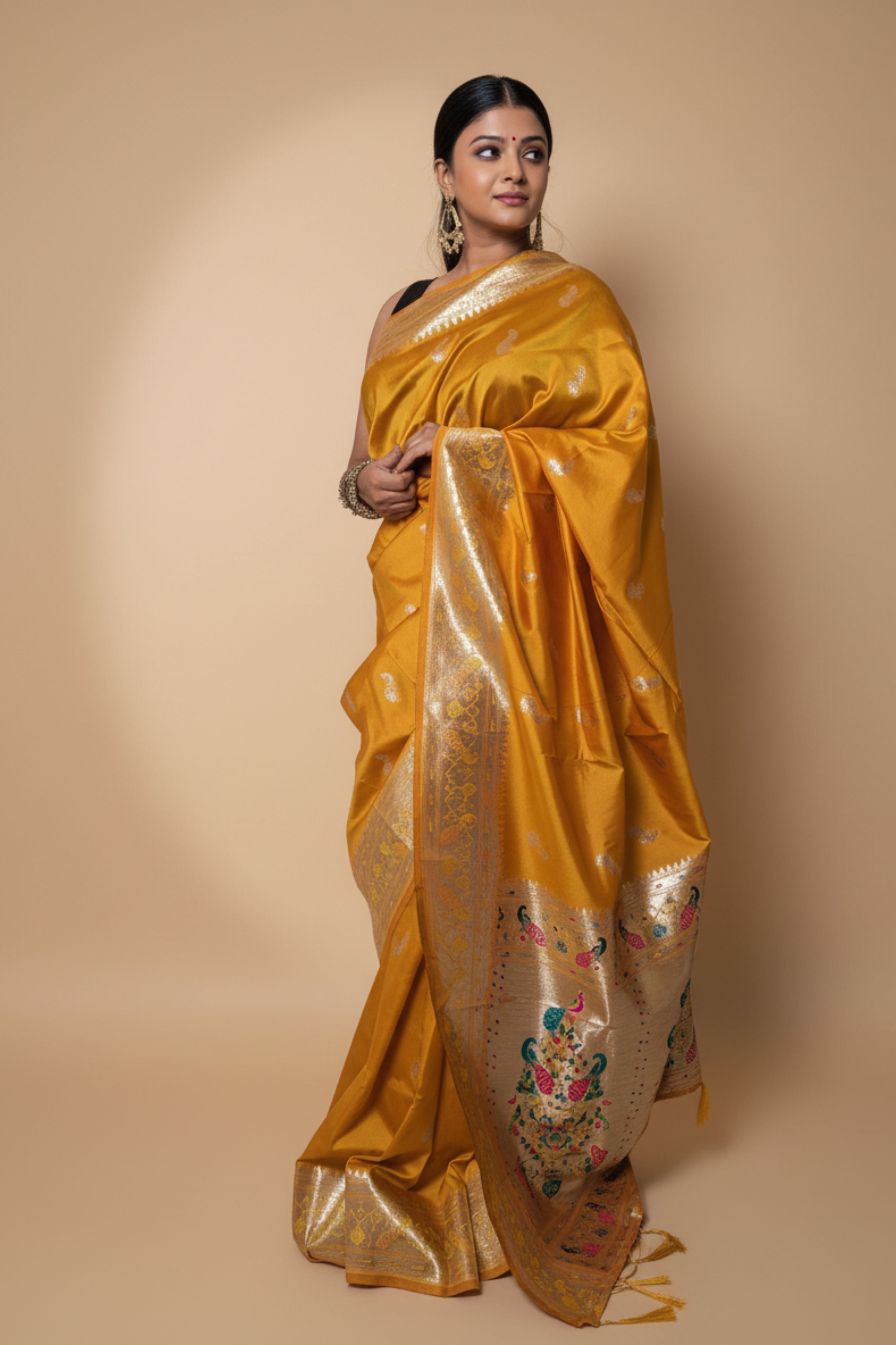 Mustard yellow glow — a timeless Paithani that brightens every celebration.