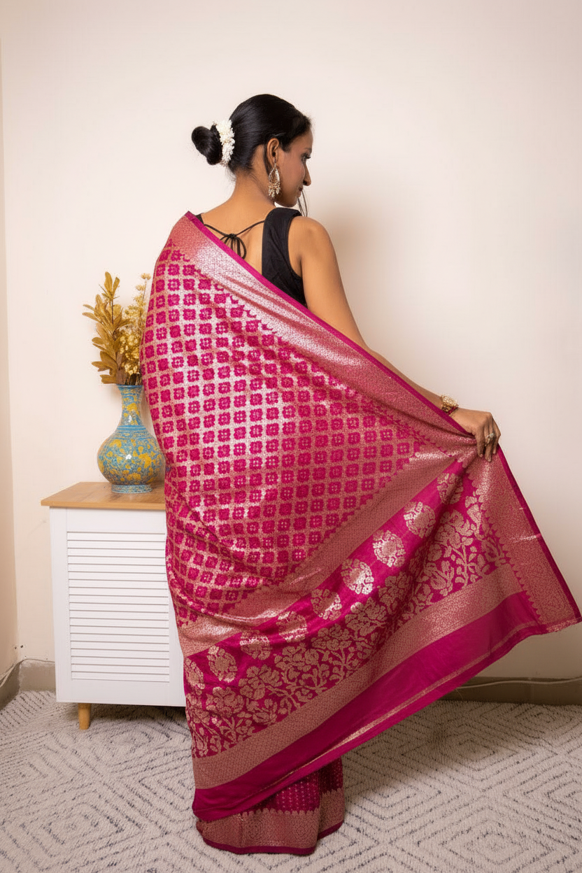A rich pink gharchola bandhej saree woven with intricate gold zari and geometric motifs. The luxurious pallu and classic buta patterns showcase traditional Banarasi weaving and heavy border for a regal finish. Perfect for weddings, festivals, sangeets and grand celebrations where a statement drape is desired. Blouse is for representation only.